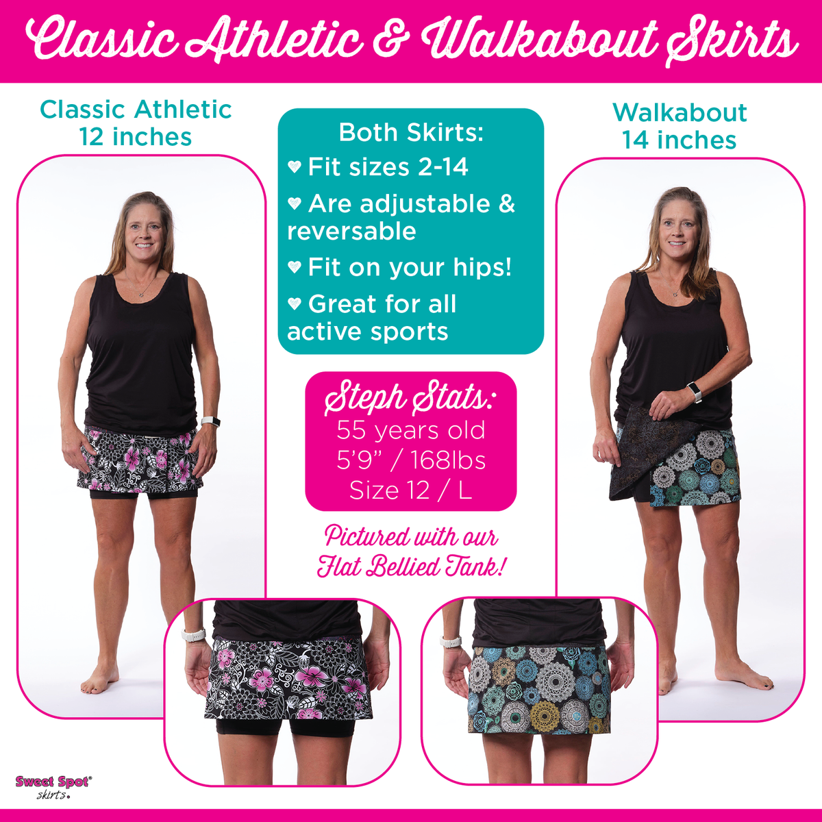 This athletic skirt was designed to wear over your favorite pair of compression shorts or tights.  You can do all activities; run, bike, hike, golf, tennis, pickleball, yoga, travel, ski AND dress it up for a night on the town with cool sandals or a great pair of boots.  Look at our inspirational photos.