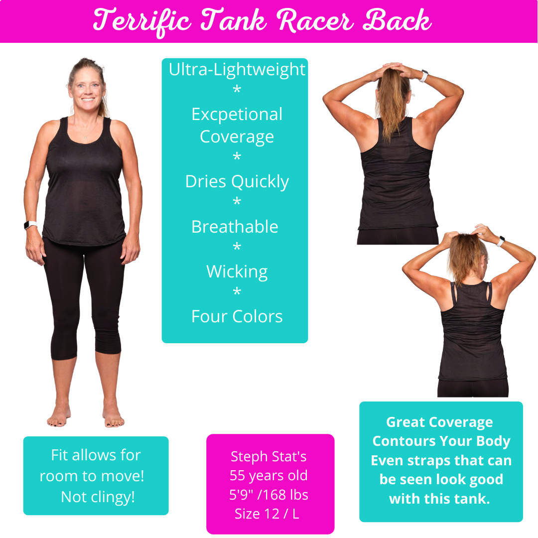 The generous racer back fit has exceptional coverage and this tank hugs your body in all the right places, without fitting snug.   The fabric is extremely light, as in 'ultra-ultra' light, breaths and wicks.